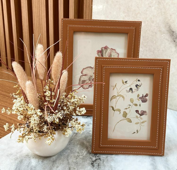 Conjunto de doisPorta Rretrato molduras de Mdf e PU em tom marrom. E um arranjo decorativo em um vaso branco em Ceramica contém flores secas e ramos, combinando com o estilo natural dos Porta Retratos . O kit parece ser ideal para uma decoração rústica ou de estilo minimalista, trazendo elementos naturais para o ambiente.