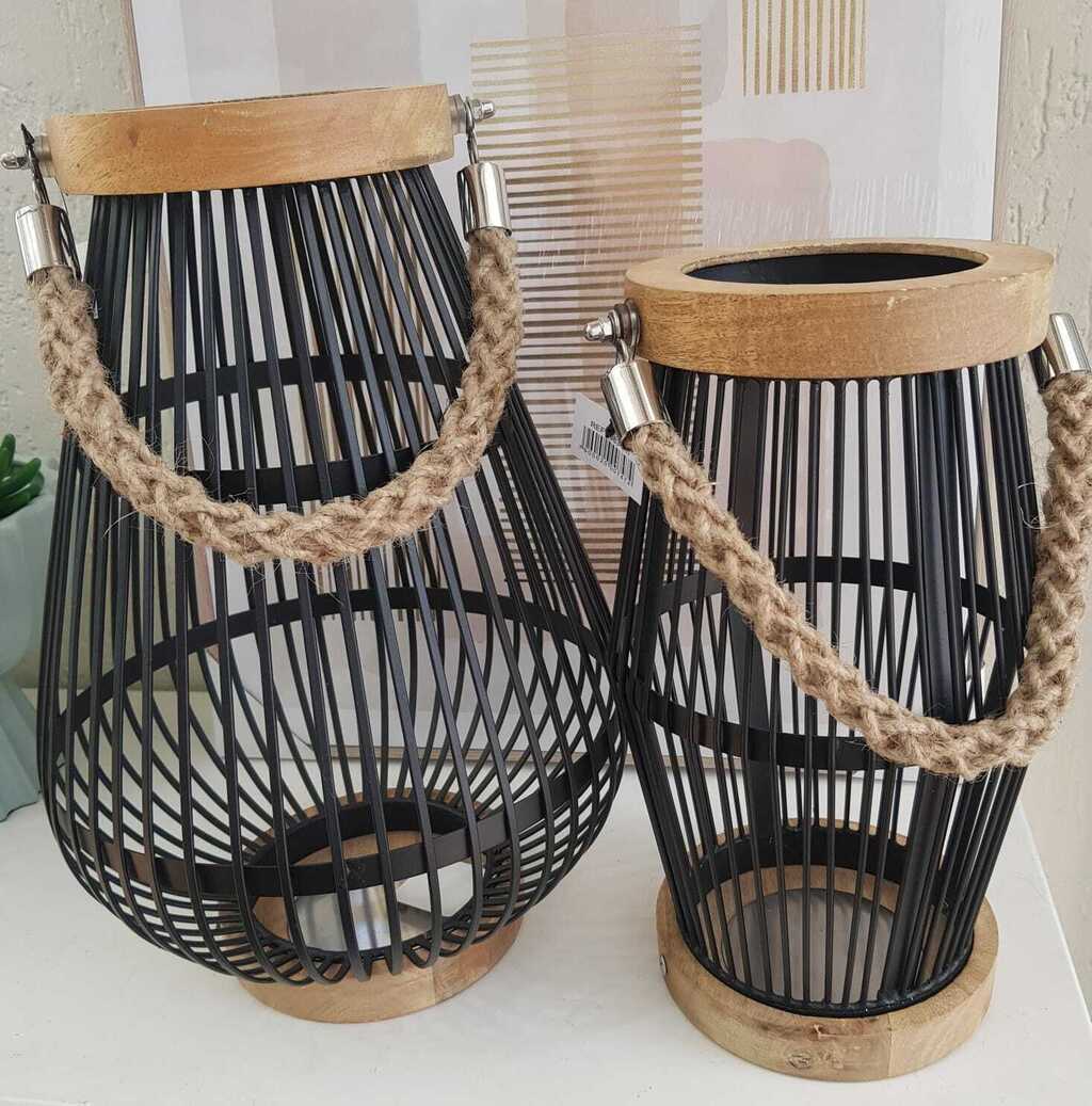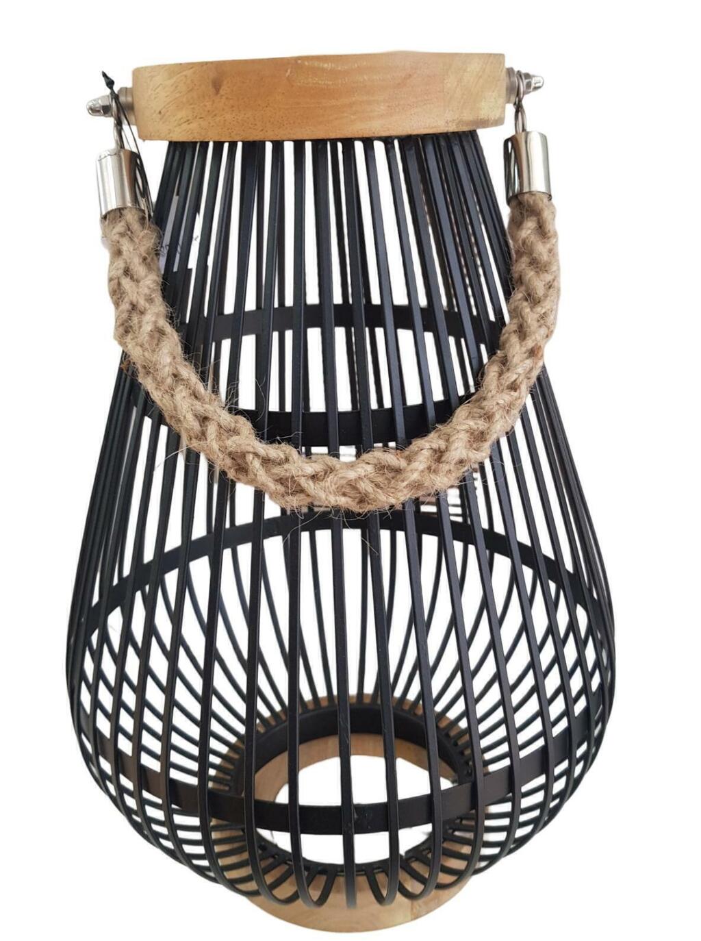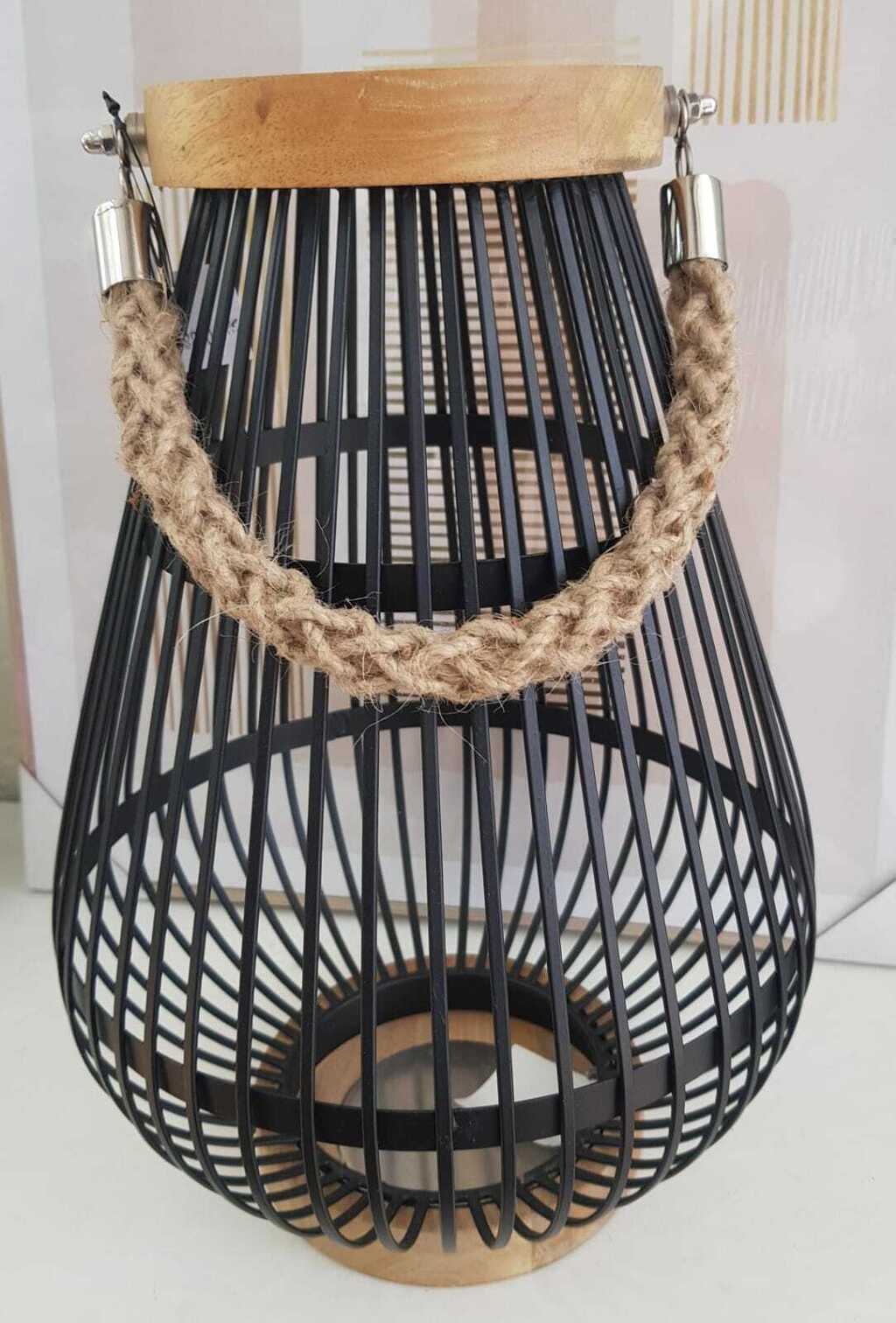 LANTERNA DECORATIVA PRETA EM METAL/ MADEIRA/CORDA